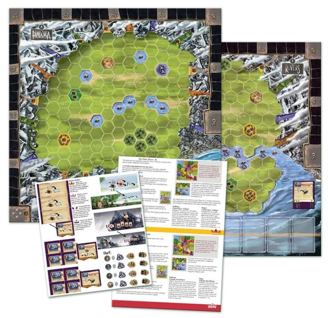 The double-sided game board of the second edition, together with the game rules for the back side (the river in German, English, French and Dutch), as well as a sticker sheet with the adaptations.