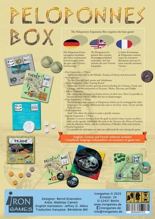 The Peloponnes Box contains all previously published Peloponnes Expansions in one box, along with the brand new “Victoria” Expansion.